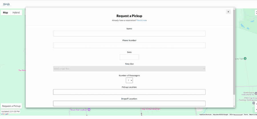- Enter your name, phone number, time slot, indicate number of passengers, type your pick up location (address will default, use key words; ie: Rivergrass, Snowbridge) and type your drop off location